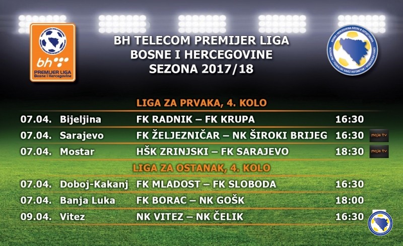 | 2 | HŠK ZRINJSKI - FK SARAJEVO | Mostar, 07.04. 2018. MOJA TV | 18:30 | |||||